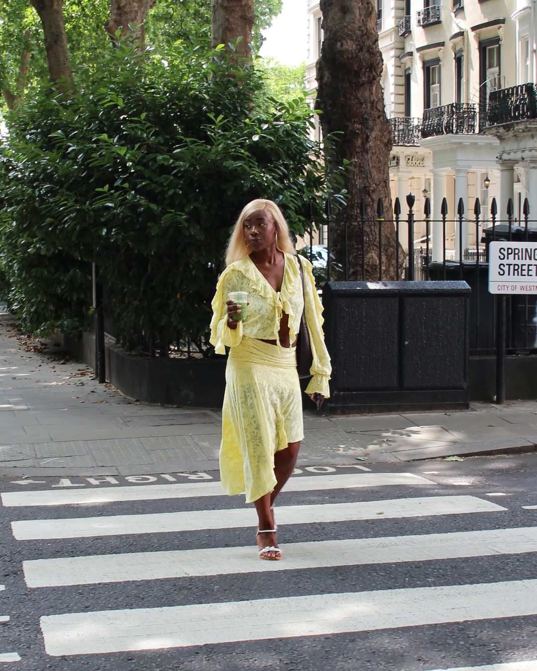 A ruffled wrap-style crop top in soft yellow with a floral jacquard texture. Designed with frill sleeves and a plunging neckline for a flattering, feminine silhouette. Style it with the matching skirt or contrast it with denim for a fresh, effortless look.