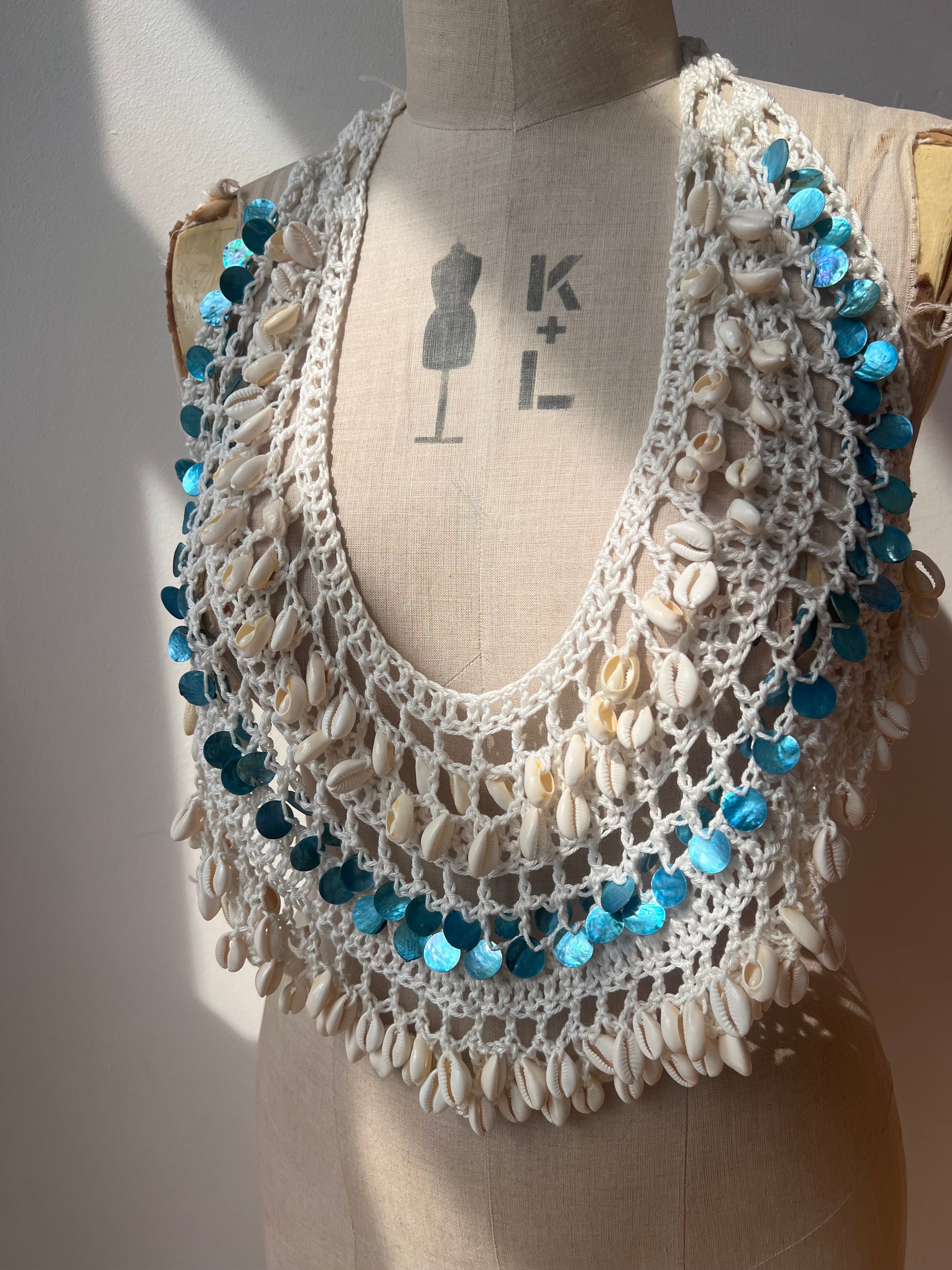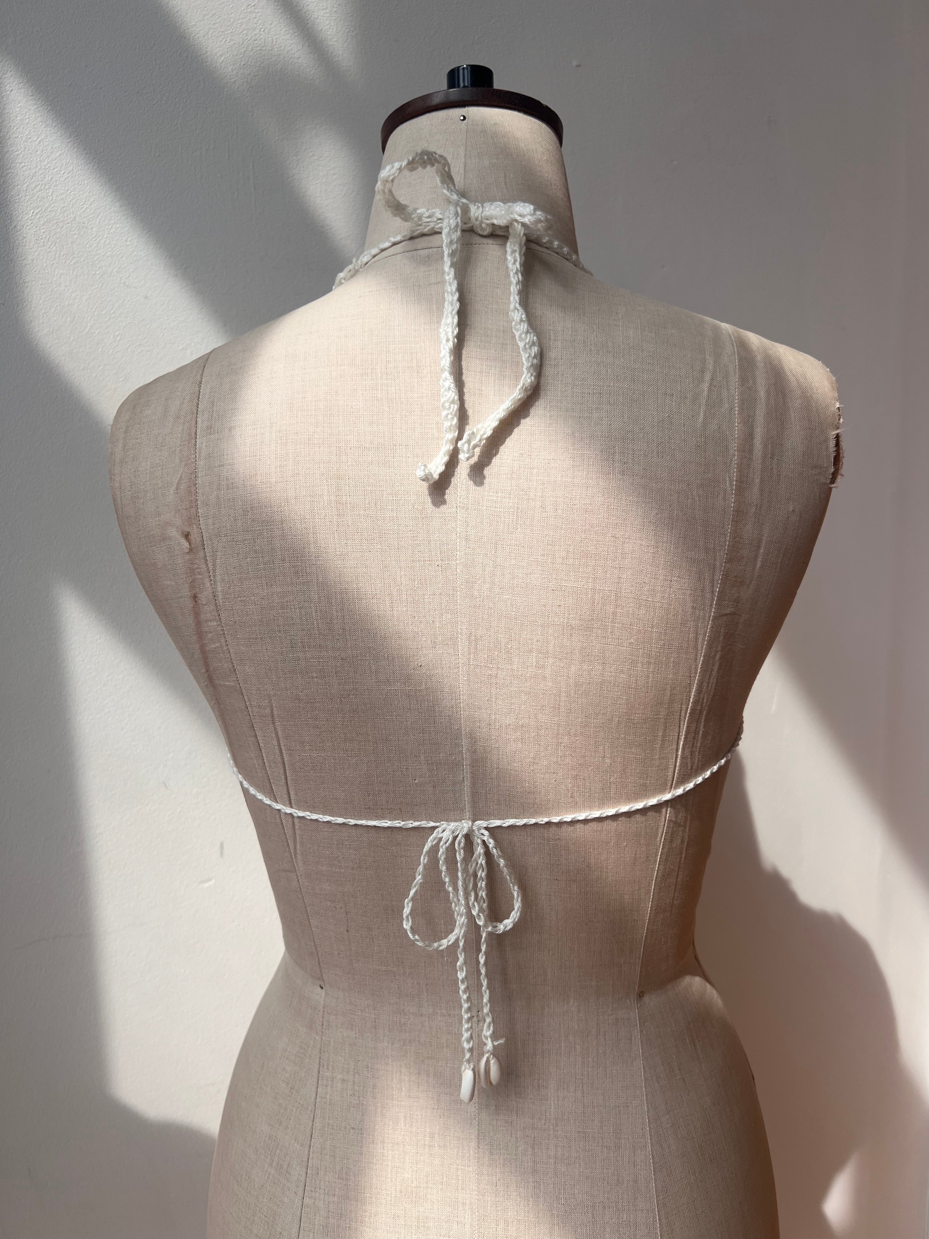 Hand-crocheted, one-of-a-kind piece with real shells. The adjustable ties back gives a flexible fit
