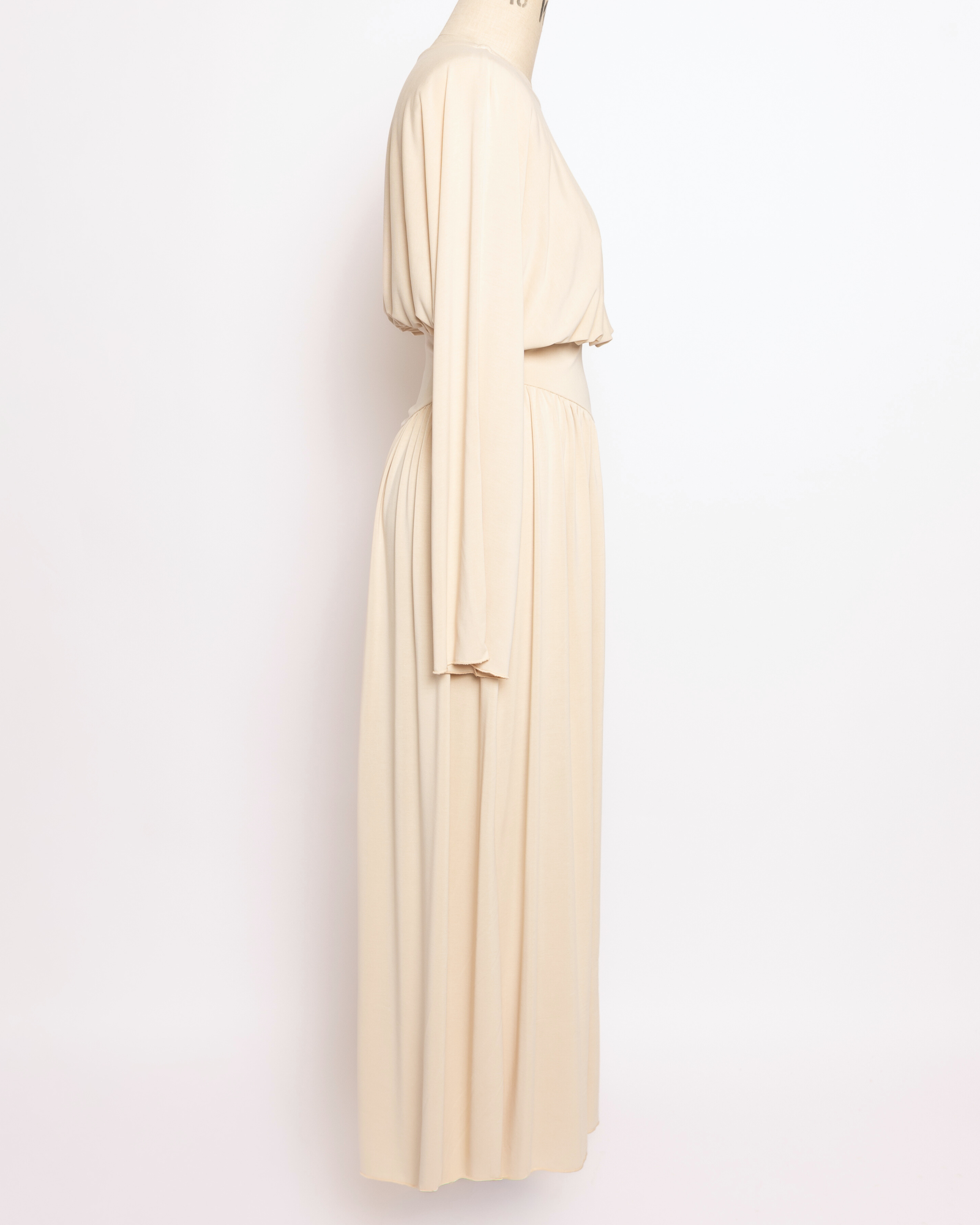 Long wide sleeves bring softness and subtle drama, balancing the defined waist and flowing skirt. A thigh-high slit adds ease and a confident edge, giving the dress graceful movement with every step. Designed to feel elevated yet effortless, it works beautifully for dinners, gatherings, and winter evenings.