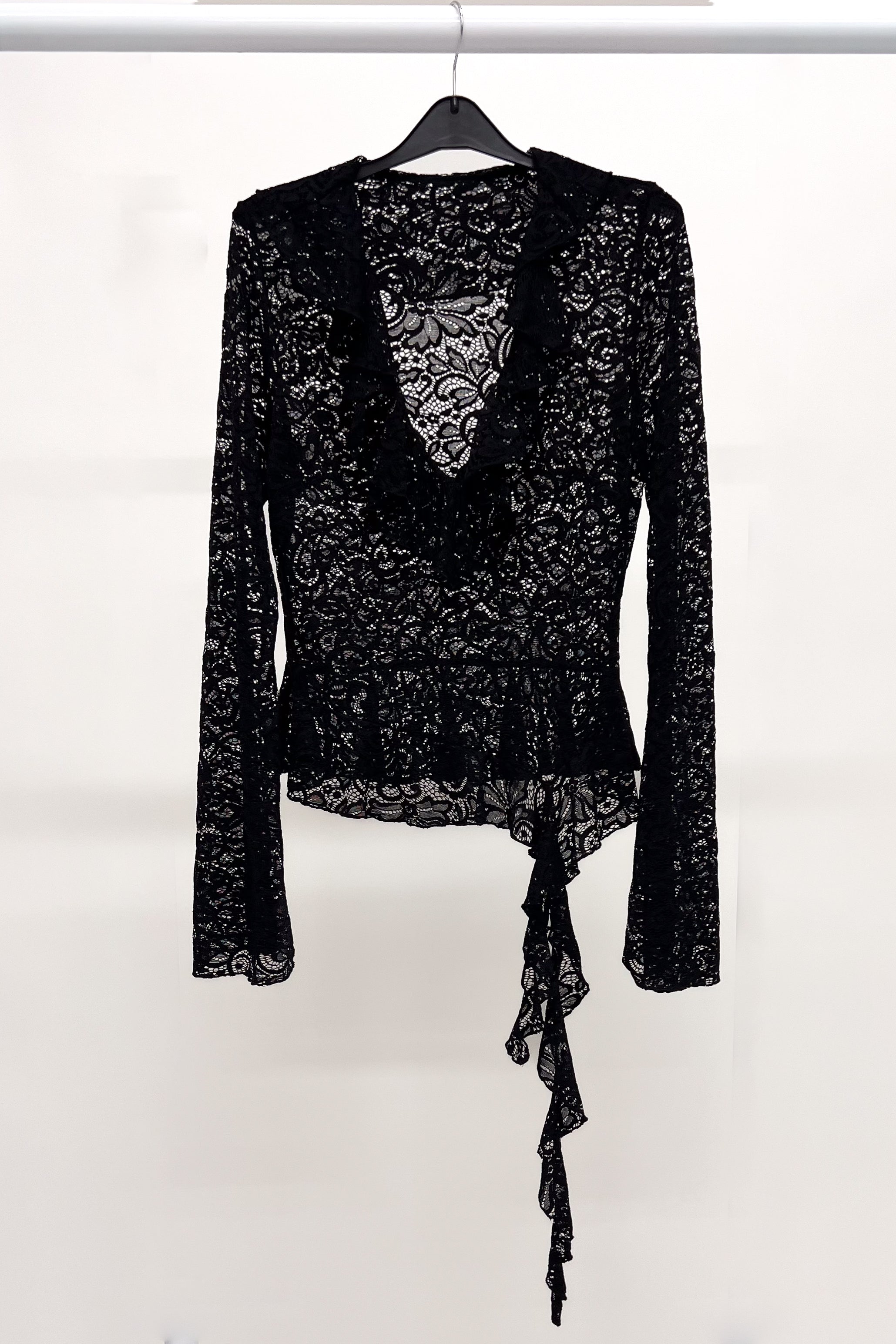 The Eclipse Lace Top is shaped to feel bold, soft, and sculptural all at once. Crafted in unlined stretch lace, it sits sheer on the body, creating a layered, romantic texture. A peplum frill at the waist adds movement and shape, while the long asymmetric frill detail drapes fluidly for a dramatic finish.