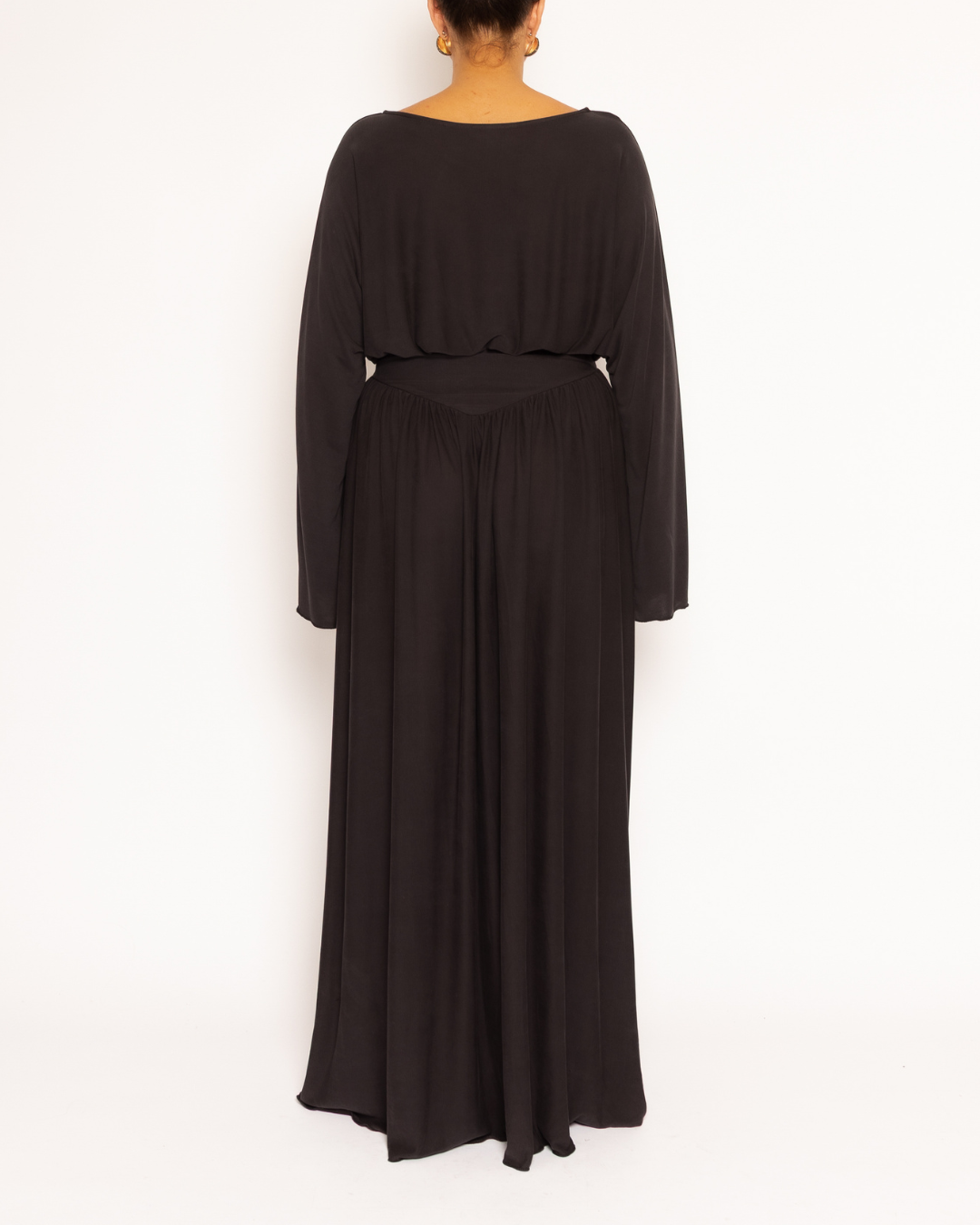 Long wide sleeves bring softness and subtle drama, balancing the defined waist and flowing skirt. A thigh-high slit adds ease and a confident edge, giving the dress graceful movement with every step. Designed to feel elevated yet effortless, it works beautifully for dinners, gatherings, and winter evenings.