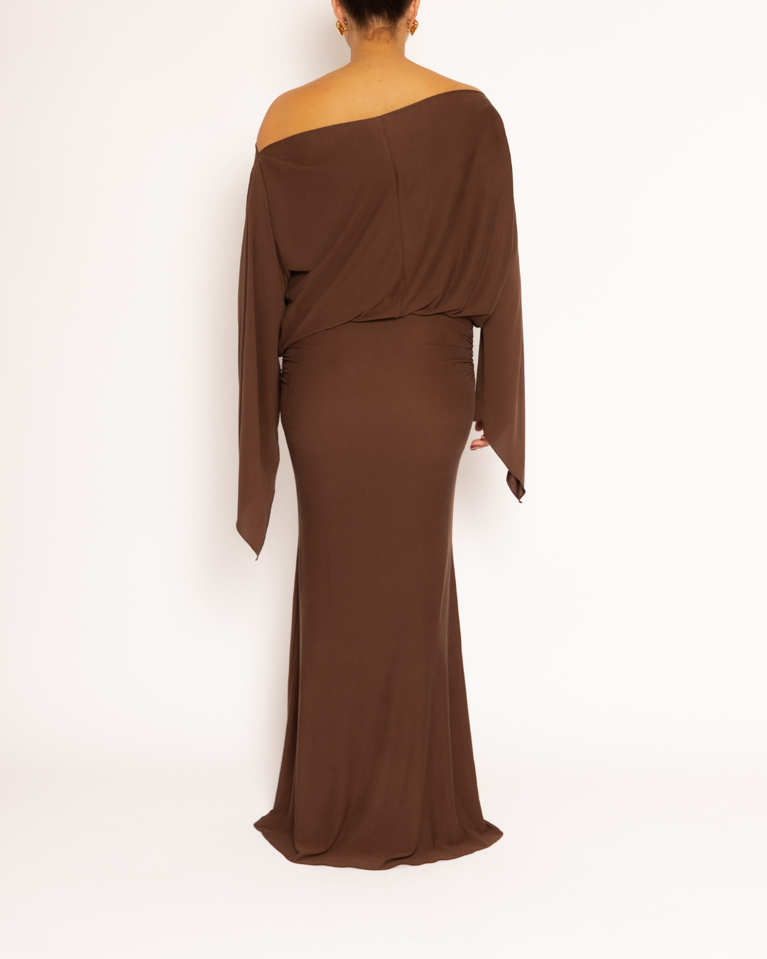 Designed as a piece you can dress up or down, it moves beautifully and sits comfortably on the body. The neckline can be styled slouchy-shoulder for a relaxed feel or worn higher for a clean, refined shape. Long wide sleeves and subtle ruching at the hips create an effortless silhouette that works across occasions.